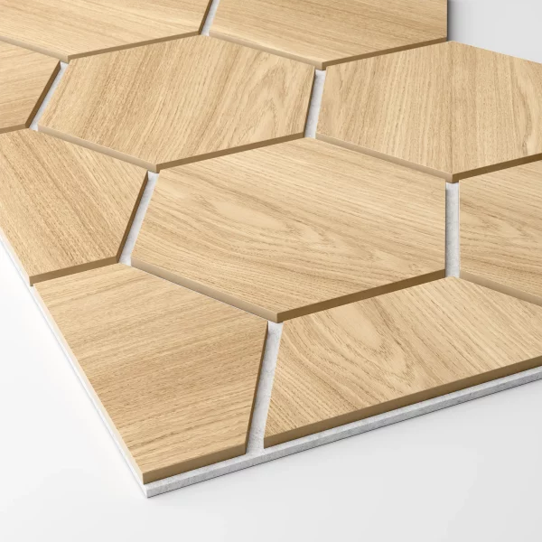 Bekijk onze Hexagon Diamond Oak akoestische panelen die gemaakt zijn met natuurlijk eikenfineer.